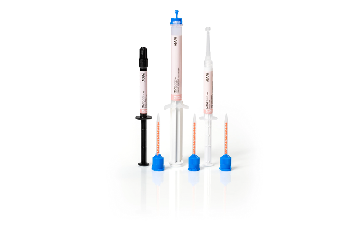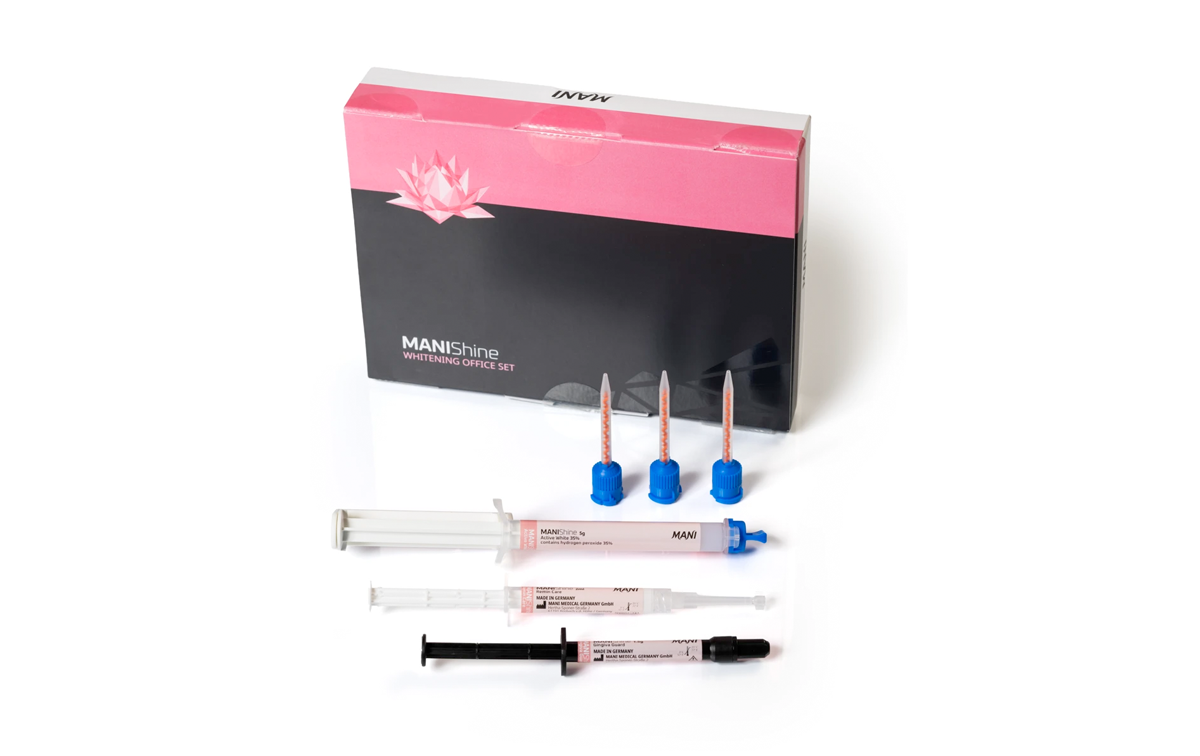 MANIShine – the whitening expert for premium results and smiling patients! Two-component in-office bleaching gel in an automix cartridge with 35% hydrogen peroxide for effective whitening of single or multiple teeth, including endodontically treated teeth. The set also includes our premium Gingiva Guard, and the remineralization paste Remin Care.